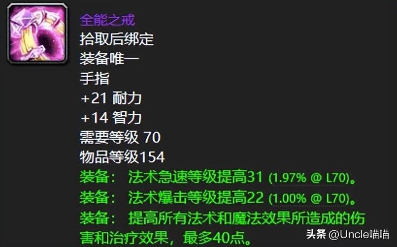 魔兽世界国际服燃烧的远征(全能之戒)属性:34 智力32 法术伤害法术暴击与命中优秀配合古尔丹之颅